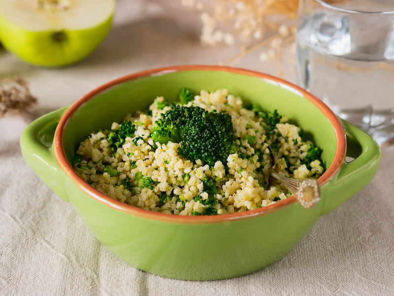 Utilizzando sempre la cottura base, condite il vostro miglio con dei broccoli sbollentati e fatti saltare in padella con olio e aglio. Una ricetta semplice ma davvero ottima, che vi assicurerà tutti i benefici sia delle crucifere sia di questo cereale.