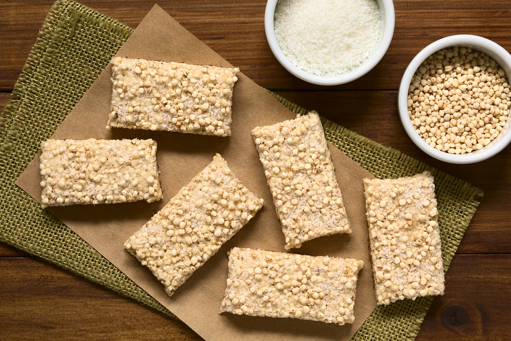- Infine, ecco la ricetta per le barrette di quinoa al cocco: fate tostare in forno a 200 gradi, su una teglia foderata 1 tazza di semi di quinoa mescolata con 1 tazza di mandorle sgusciate e affettate e mezza tazza di cocco essiccato e tritato. Mettete poi tutto in un frullatore insieme a mezza tazza di mirtilli essiccati e mezza di mele disidratate. Frullate, quindi aggiungete mezza tazza del vostro succo di frutta preferito e frullate ancora. Sistemate il composto su una teglia coperta da carta forno, spolverando poi con dei semi di sesamo e di girasole. Mettete in frigo per una notte e tagliate a barrette.