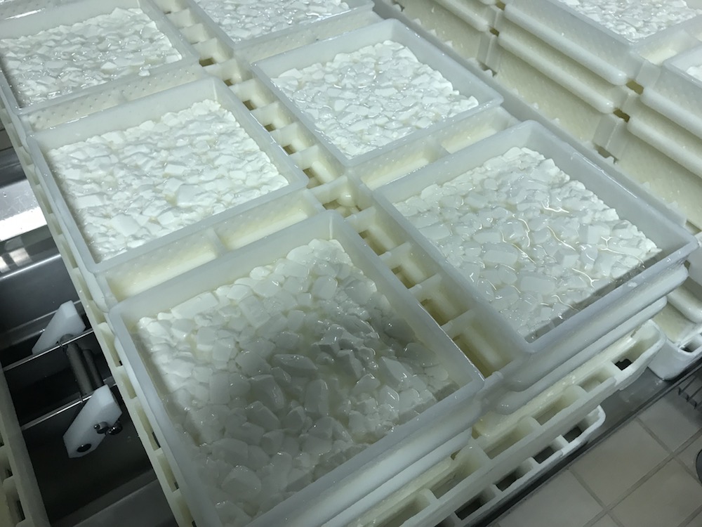 Partiamo dall’inizio: il latte che viene ricevuto e pastorizzato quotidianamente è preparato per la fase 2, cioè la coagulazione. Questa fase prevede che il latte venga unito al caglio, che innescherà il processo di coagulazione e quindi di “solidificazione” del prodotto. Il nostro latte coagulato viene quindi tagliato in piccoli cubetti così che il siero (la parte liquida) venga divisa più facilmente dalla parte solida del prodotto.