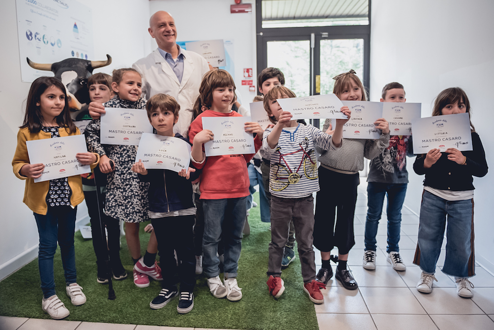 Ok, il giro per lo stabilimento è finito, ma la sorpresa più grande deve ancora arrivare. Già, perché da Galbani anche i bambini preparano il formaggio con le loro mani! Nel Laboratorio che Certosa Galbani aveva preparato per noi mamme del blogtour, c’erano infatti ad attendere i nostri bimbi due vere e proprie scienziate del formaggio. Sì, come potete immaginare, i bimbi sono impazziti! Armati di cappellino da cuoco, grembiule e retina per i capelli, hanno preparato il formaggio più fresco del mondo (e ovviamente Luca l’ha anche mangiato!). Qui sotto vedete la gioia dei bimbi con il loro diploma di mastro casaro!