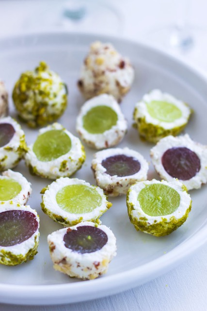 - Palline di feta o formaggio di capra: gli ingredienti per questa ricetta sono una manciata di acini d’uva, 450 grammi di formaggio molle (la feta o quello di capra andranno benissimo), mezza tazza di mandorle pelate tritate e di pistacchi tritati (mischiati insieme) e un po’ di miele. Rotolate gli acini d’uva nel formaggio, coprendoli molto bene, quindi spalmateci sopra un pochino di miele e rotolateli nel mix di frutta secca. Lasciate riposare le palline in frigorifero, quindi tagliatele a metà e servitele su un piatto piano: l’effetto sarà meraviglioso (come il gusto!)