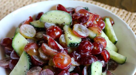 - Insalata di uva e cetrioli: niente di più semplice. Tagliate dell’uva a metà, aggiungete un cetriolo a fettine e quindi condite con olio, sale, pepe, yogurt e semi di papavero.
