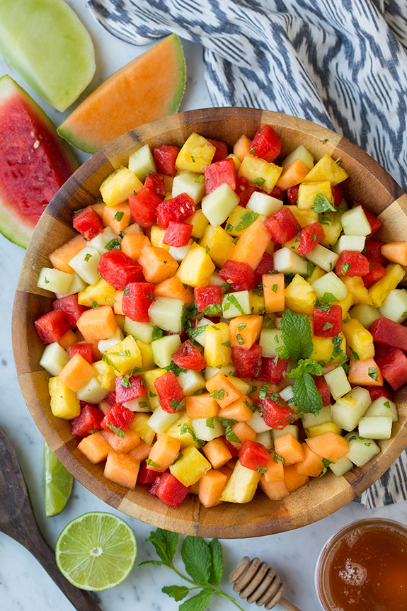 - Freschezza intensa la otterrete combinando melone, anguria e ananas. Tagliateli tutti a cubetti quindi condite con limone e sciroppo d'acero, completando con qualche fogliolina di menta sminuzzata e un paio intere per guarnire.