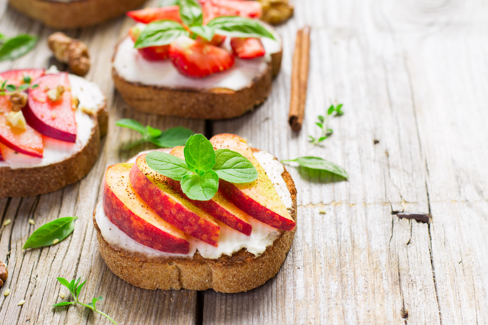 - Passiamo poi alle bruschette di frutta, perfette per le feste in orario merenda! Prendete del classico pane integrale da tagliare a fette e grigliatelo. Dopodiché spalmate del formaggio cremoso o della leggera ricotta sulla superficie e decorate con delle fettine di mela, di wiki, di pera o di fragola, completando con una granella di nocciole o una foglia di menta o basilico.