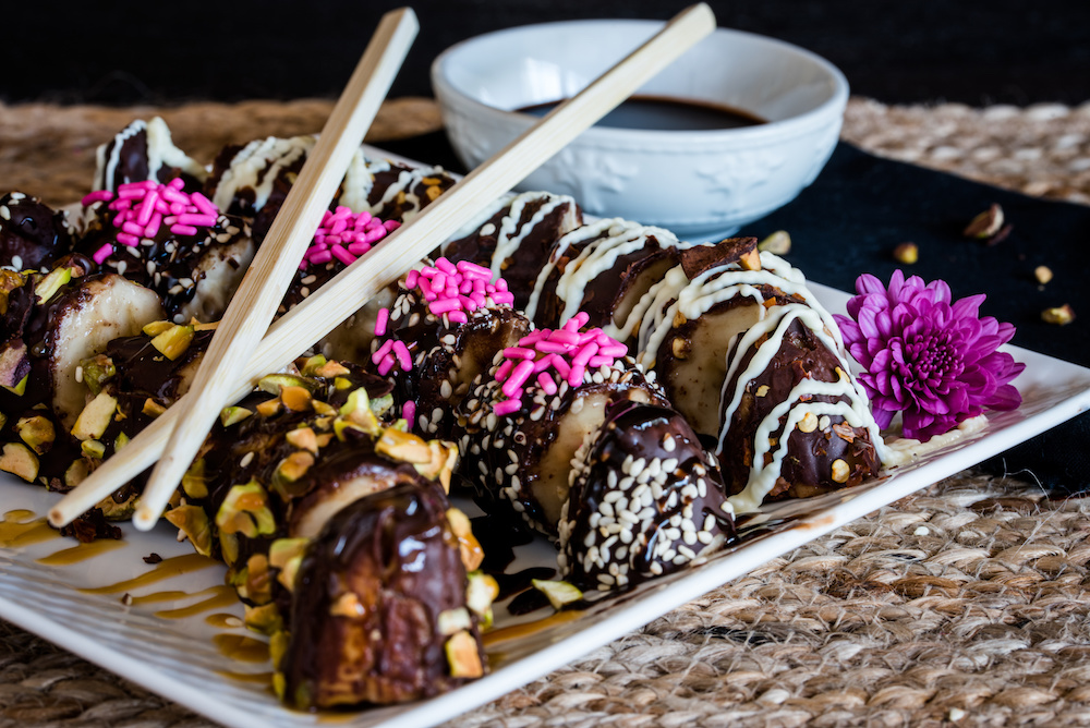 - Altra versione del sushi-fruit è sempre con la banana, ma stavolta ancora più golosa: sciogliete del cioccolato fondente in un pentolino e poi versatelo sulla banana sbucciata. Quando è ancora caldo cospargete la superficie con della frutta secca tritata o, di nuovo, con il mix di semi.