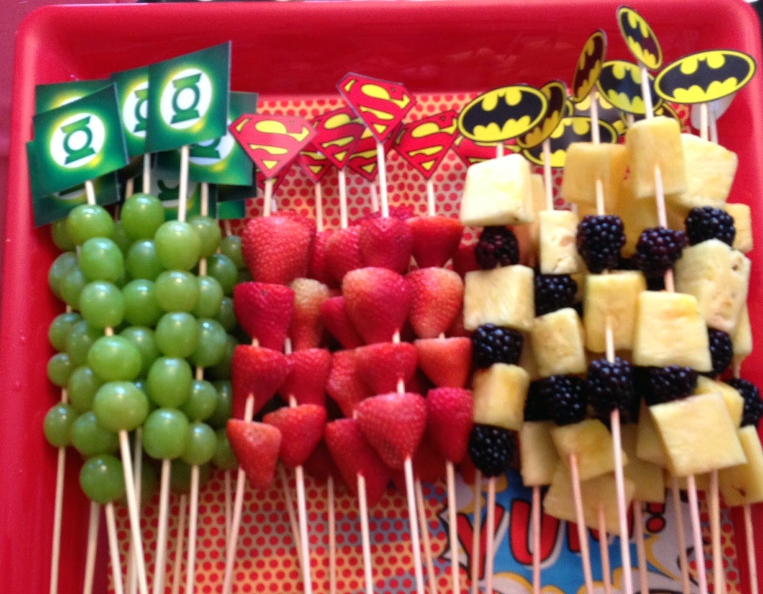 - Se invece appassionati di supereroi, fate spiedini a tema: con bandierine che riportano il logo dei vari supereroi e scegliendo la frutta che ne ripropone i colori della tuta passerete una serata a tema Marvel & co.!