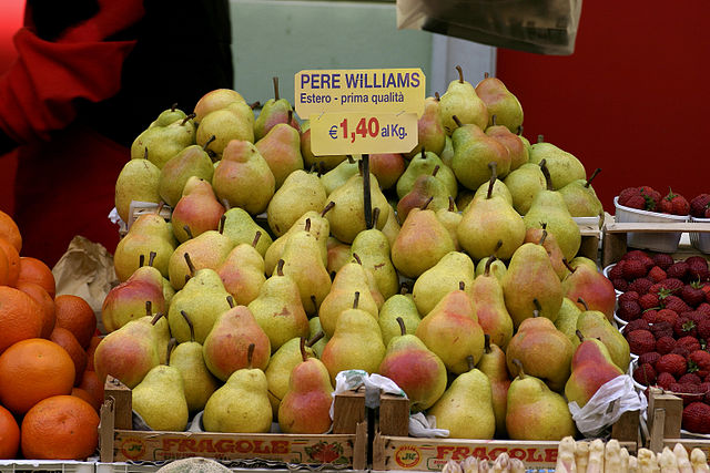 Pera Williams: partiamo dalla più nota, la pera Williams, quella più diffusa nei nostri mercati forse anche per la sua versatilità: è infatti buonissima in macedonie e frullati, ma anche come accompagnamento in cocktail alcolici o analcolici, in marmellata e in succhi di frutta fatti in casa. La sua buccia è tendente al verde (con punte di giallo) e la polpa molto chiara, verso il bianco. È molto zuccherina, e per questo ottima anche da sgranocchiare così, ma per lo stesso motivo è più delicata e andrebbe protetta dai vari traumi perché soggetta ad ammaccature. Si trova sui mercati da agosto a dicembre.