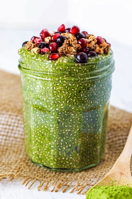 - E infine una bella tazza di pudding al tè matcha: preparatelo la sera prima, e godetevelo al mattino. Prendete una manciata di semi di chia e mescolatela in una ciotola con mezza tazza di latte di soia. In un’altra ciotola mescolate due cucchiaini di tè matcha con un pochino di acqua calda, fino ad ottenere una crema omogenea. Aggiungete il tè matcha al latte e ai semi di chia, mettete in una tazza o in un barattolo e fate riposare tutta notte. Servite con una manciata di muesli e qualche frutto di bosco.