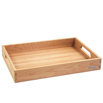 - La proposta sopra riguarda un vassoio in legno, materiale naturale tra i preferiti nell'educazione Montessori, che preferisce non ricorrere a materiali artificiali o troppo plasticosi ed evitare colori eccessivamente sgargianti. Il legno va bene per la maggior parte delle attività, ma a volte la plastica è necessaria, soprattutto quando si gioca con i cibi come le verdure o la farina (che infiltrandosi nel legno farebbero proliferare i batteri). Questo vassoio coniuga bene la necessità di maniglie, di materiale (almeno in parte) naturale, di semplicità e di comodità, grazie alla plastica sul fondo.