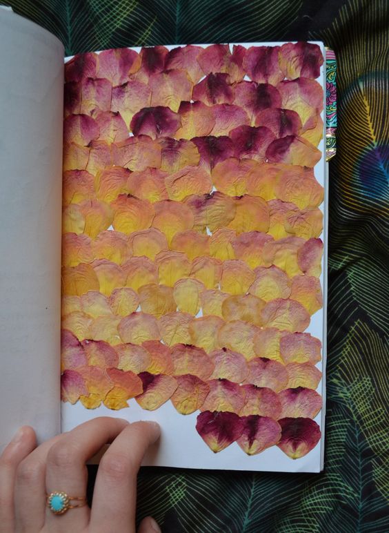 L’importante è sbizzarrirsi. Un’idea è quella di raccogliere foglie o petali per creare dei pattern affascinanti, incollandoli direttamente alla pagina: pian piano seccheranno e lasceranno bellissimi disegni.
