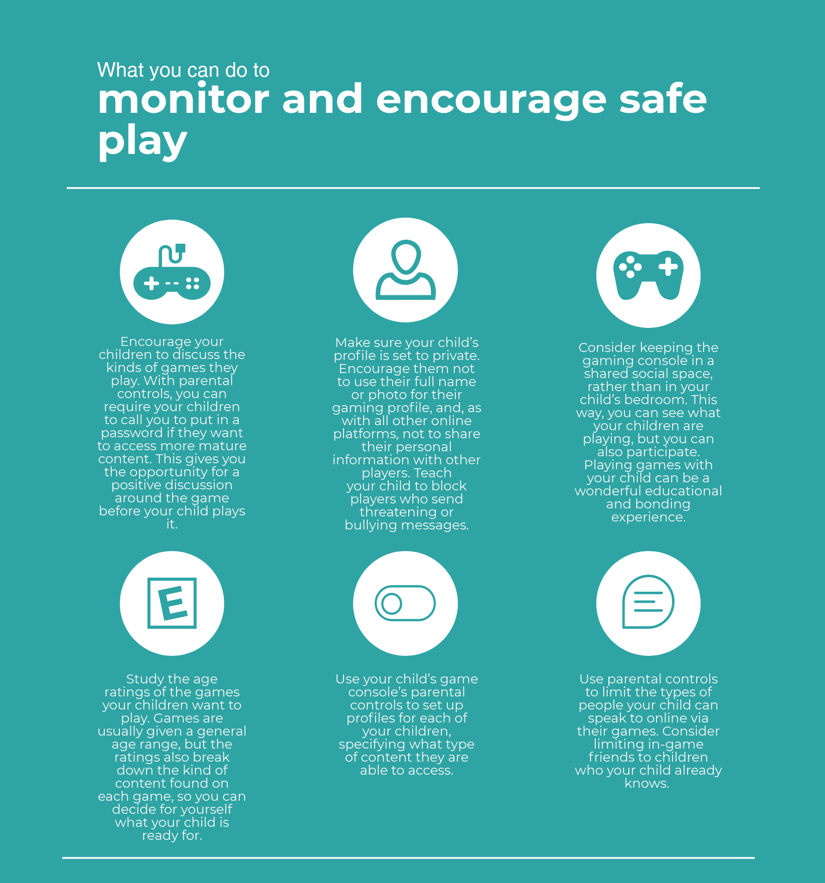 - Studiamo sempre i videogiochi insieme prima di giocarci per la prima volta, con i genitori, in modo da capire il tono del gioco e decidere se impostare una password parental-control per giocare solo in presenza di un adulto (o non giocarci proprio).