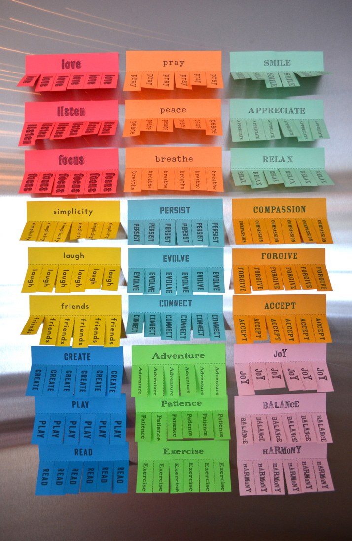 Sui fogli colorati stampate una parola bella grande (scegliendola tra le più significative o tra quelle su cui avete voglia di riflettere: gioia, calma, rivalsa, armonia, respira, sii creativo, leggi, accetta, avventura. Insomma, fate voi!), e ripetetela con un carattere più piccolo al di sotto, in verticale, in modo da ottenere quella forma di cui parlavamo, quella dei volantini dai quali si può staccare il numero di telefono (ritagliando quindi le frangette).