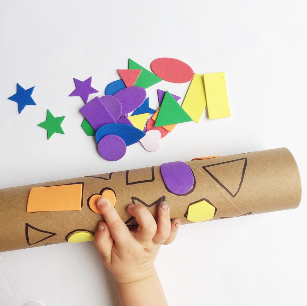 Per imparare le forme, disegniamo sul rotolo stelle, quadrati e cerchi, e poi ritagliamo le stesse forme su della carta. I bimbi dovranno incollarle al posto giusto.