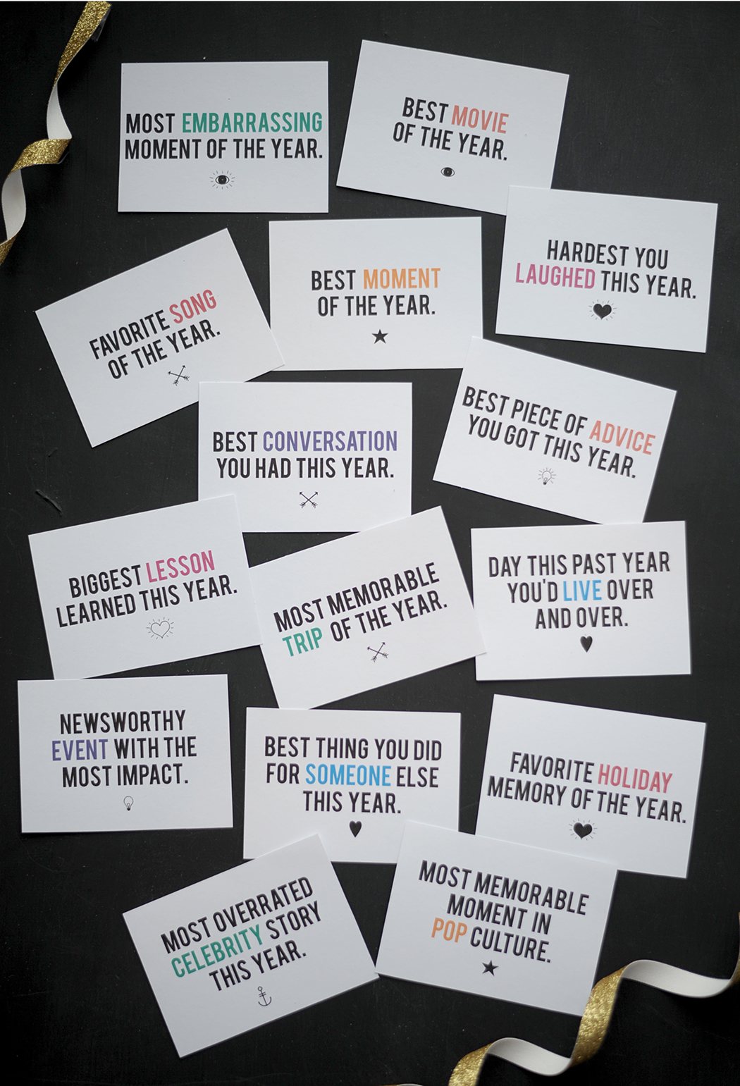 Un bel gioco da fare seduti a tavola o in cerchio: in una ciotola mescolate tante carte sulle quali avete scritto frasi riguardati l'anno precendente: "il più bel momento del 2015", "la risata più forte", "l'esperienza più strana", "la mostra più bella", "la lezione che ho imparato", "la celebrity più chiacchierata senza motivo", "il viaggio più figo", ecc... A turno si pesca un bigliettino e si risponde alla domanda: si creerà un'atmosfera bellissima!