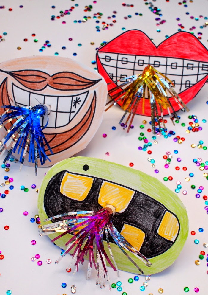 Createle la sera stessa con i bambini, prima del countdown: basteranno dei fogli dai quali ritagliare delle divertenti bocche (con l'apparecchio, da mostro, da babbo natale, da animale), dei pennarelli e alcune trombette colorate! Da suonare allo scoccare della mezzanotte per ridere a crepapelle.
