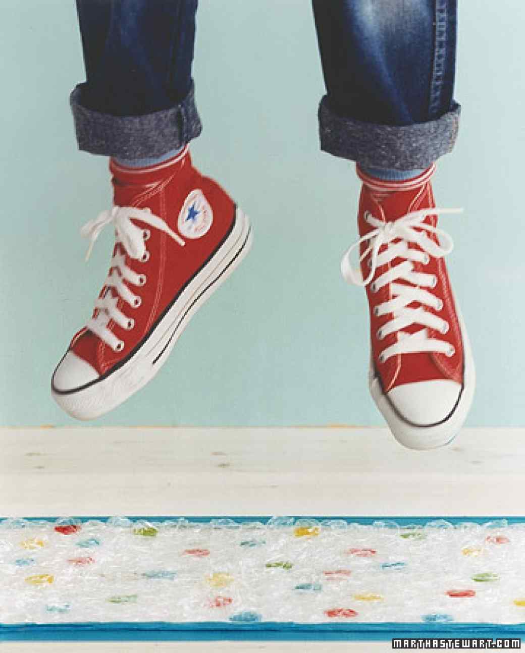 Per continuare a fare un po' di casino dopo le trombette (a Capodanno è concesso!) ecco il gioco delle bolle! Prendete delle bolle da pacco, colorate il fondo piatto di ogni pallina con dei pennarelli indelebili, posate a terra una striscia di carta da pacco larga quanto il foglio di bolle e incollate il tutto al pavimento con del nastro adesivo. Dopodiché, saltate! Già è divertente con le mani, figuratevi con i piedi.