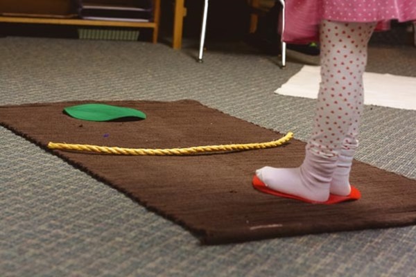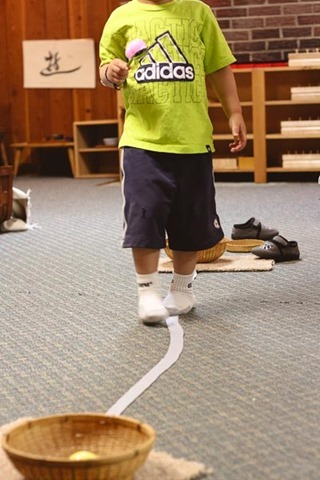 Il bambino dovrà seguire il percorso camminando sulla corda, tenendo allo stesso tempo in mano un cucchiaio contenente un uovo, prima con la destra e poi con la sinistra.
