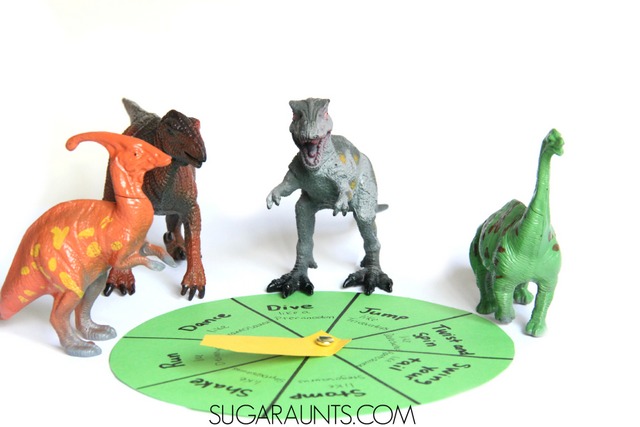 Create una "ruota della fortuna" sulla quale ogni spicchio reciterà un movimento diverso di un determinato dinosauro: "salta come un triceratopo", "balla come un T-Rex", "rotola come un brachiosauro". Inventatene più che potete!