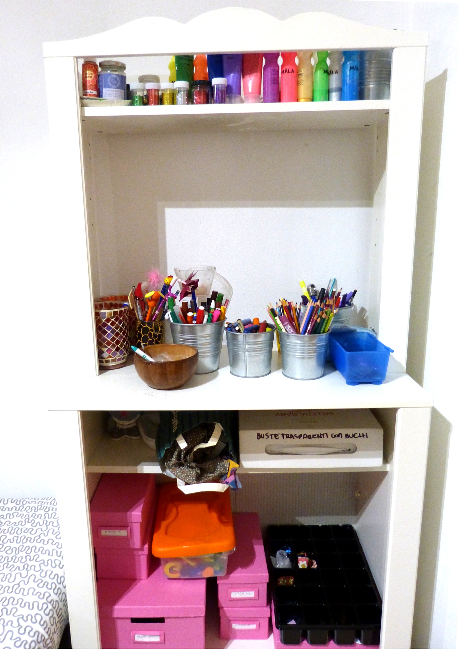 Ecco la nostra credenza con il materiale artistico organizzato e ben visibile: