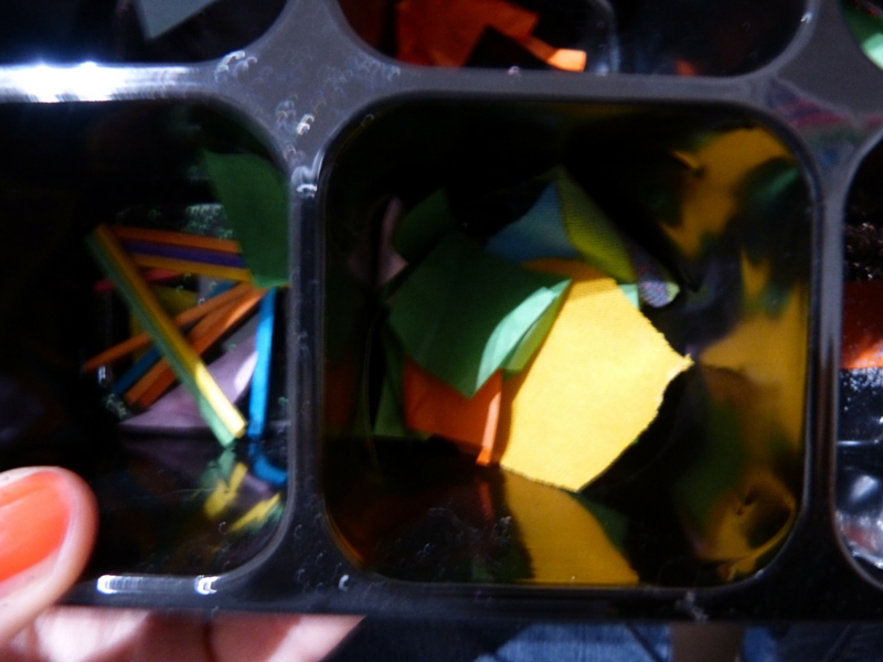 Infine in basso abbiamo il sacchetto delle stoffe, la scatola arancione con il materiale misto (occhietti, scovolini, forme geometriche, pon pon etc...), le scatole rosa contenenti materiale di cancelleria di scorta e il contenitore nero. Questo era originariamente un vassoio per piantine che ho chiesto gentilmente al mercato al banco delle piante: portato a casa l'ho lavato ed è diventato perfetto per inserire materiale da utilizzare per decorare (perline, pezzi di carta, fili...). Lo rimpinguiamo a seconda dell'attività che vogliamo fare così da avere materiale facile e ben visibile sul tavolo.