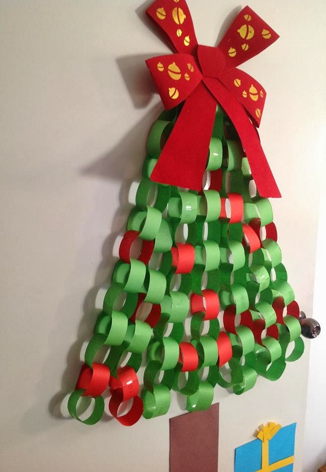 Niente di più semplice: armati di strisce di carta e scotch, insieme ai bimbi si possono creare una decina di catenelle di carta verde (inserendone ogni tanto alcune colorate a simbolizzare le decorazioni), da sistemare poi alla parete con la forma dell'albero di Natale (legandole in cima con dello spago e allargandole sul fondo a formare la silhouette dell'albero - puntandole con dello scotch o alcune puntine da disegno). Per completare, un fiocco sulla cima coprirà lo spago che le trattiene e formerà la perfetta punta!