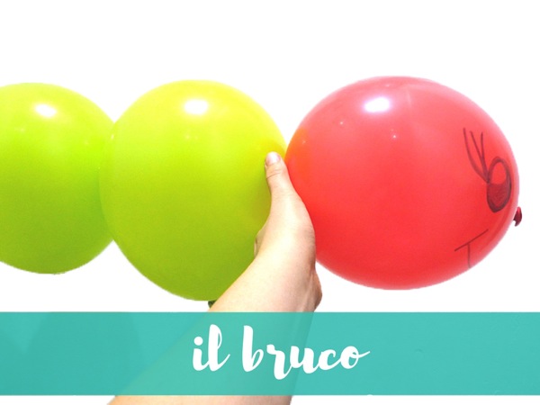 - L’idea di utilizzare i palloncini come “corpo” degli animali può essere sfruttata anche per creare un divertentissimo bruco: basta utilizzare palloni di due differenti colori (uno per la testa e un altro per il lunghissimo corpo) e affiancarli l’uno all’altro formando il vermicello. Non serve riempirli d’elio: in questo caso bisognerà incollarli con del nastro adesivo alla parete o allo stipite della porta (completando con piccole zampette di cartoncino nero e occhi e bocca sul palloncino “testa”).