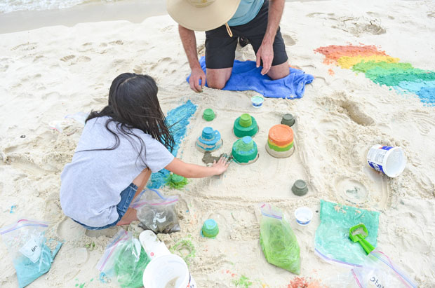 Colorare la sabbia per castelli meravigliosi: basta del colorante alimentare per trasformare la sabbia in un materiale ancora più fantasioso