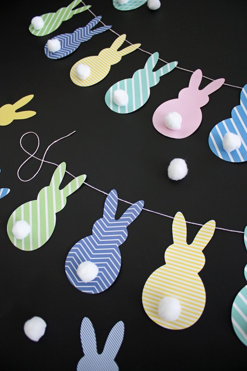 5. Non solo: i piccoli pompon possono diventare le codine morbidose dei coniglietti che ritaglierete e organizzerete a formare uno striscione supercarino!