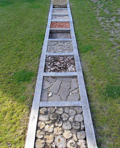 4. All'aperto possiamo davvero sbizzarrirci e creare, come in questo caso, delle sensory road fisse: assi in legno e all'interno materiali naturali come paglia, lenticchie, fagioli, farine... Bellissima idea per le scuole!