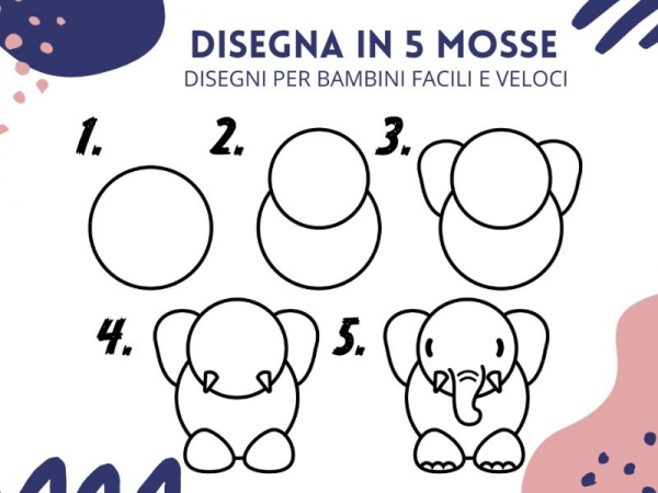 Questi disegni altro non sono che semplicissimi consigli per tracciare il profilo degli animali preferiti dei bambini in cinque mosse. In ogni immagine scaricabile troverete cinque disegni, ognuno ad indicare le varie fasi del disegno. Ad esempio, per l’elefante si parte con un facilissimo cerchio, al quale si aggiungono via via un altro cerchio, le orecchie, le zampine e le zanne e gli ultimi dettagli.