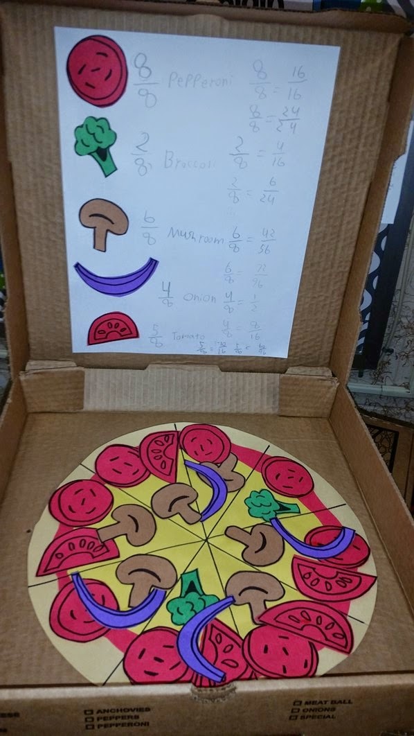 La forma della pizza è tradizionalmente la più adatta per capire visivamente e intuitivamente le frazioni, perché già normalmente la tagliamo in parti uguali che se ricostruite ricompongono l’intero. Possiamo quindi esercitarci alle frazioni mentre la mangiamo oppure inventare un gioco come questo: disegniamo una pizza e dividiamola in tot spicchi (partiamo da 10, così è più semplice). Su ogni fetta disegniamo o incolliamo vari ingredienti, che si troveranno però sparsi, e non su tutte le fette. Alla fine bisognerà disegnare una legenda spiegando in quante fette ci sono i vari ingredienti (ad esempio, i funghi saranno 6/10, le cipolle 4/10).