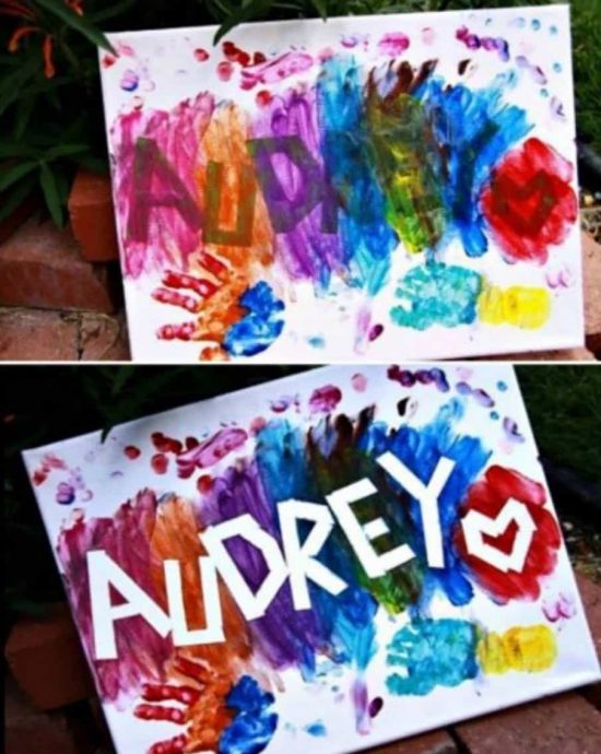 Per un disegno astratto con il nome dei bimbi, prendiamo del nastro adesivo leggero (come il washi tape o quello di carta) e scriviamo il nome del bambino. Facciamogli colorare e pasticciare con le dita il foglio e poi stacchiamo il nastro: rimarrà impresso il nome, da appendere in cameretta!