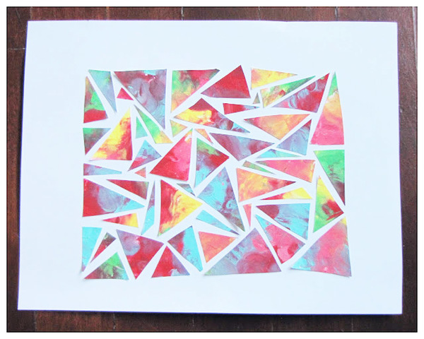 Possiamo anche colorare in maniera super astratta un foglio, poi ritagliare in forma di triangoli tutto il foglio e rincollarli su un altro foglio per una decorazione molto geometrica.