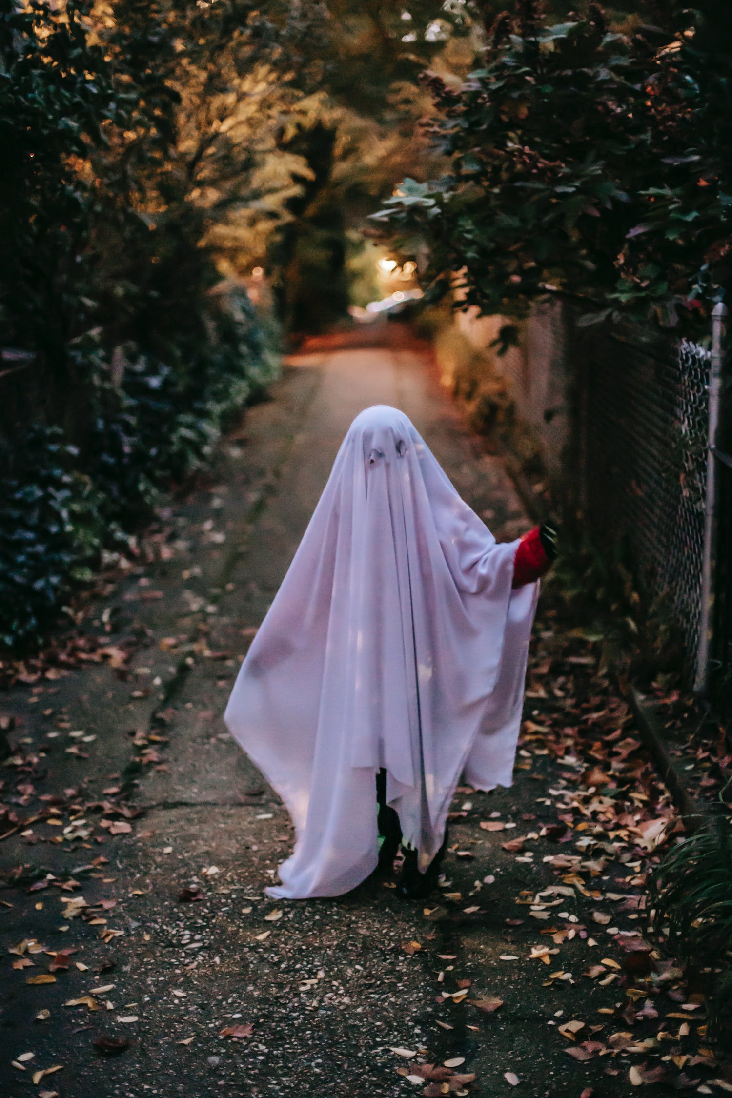 Un classico di Halloween: il fantasma. Basta conservare un vecchio lenzuolo, da trasformare in un fantasma semplicemente appoggiandolo sulla testa e ritagliando due occhietti, eventualmente accorciandolo con le forbici per evitare che il bambino o la bambina inciampi nei lembi inferiori.