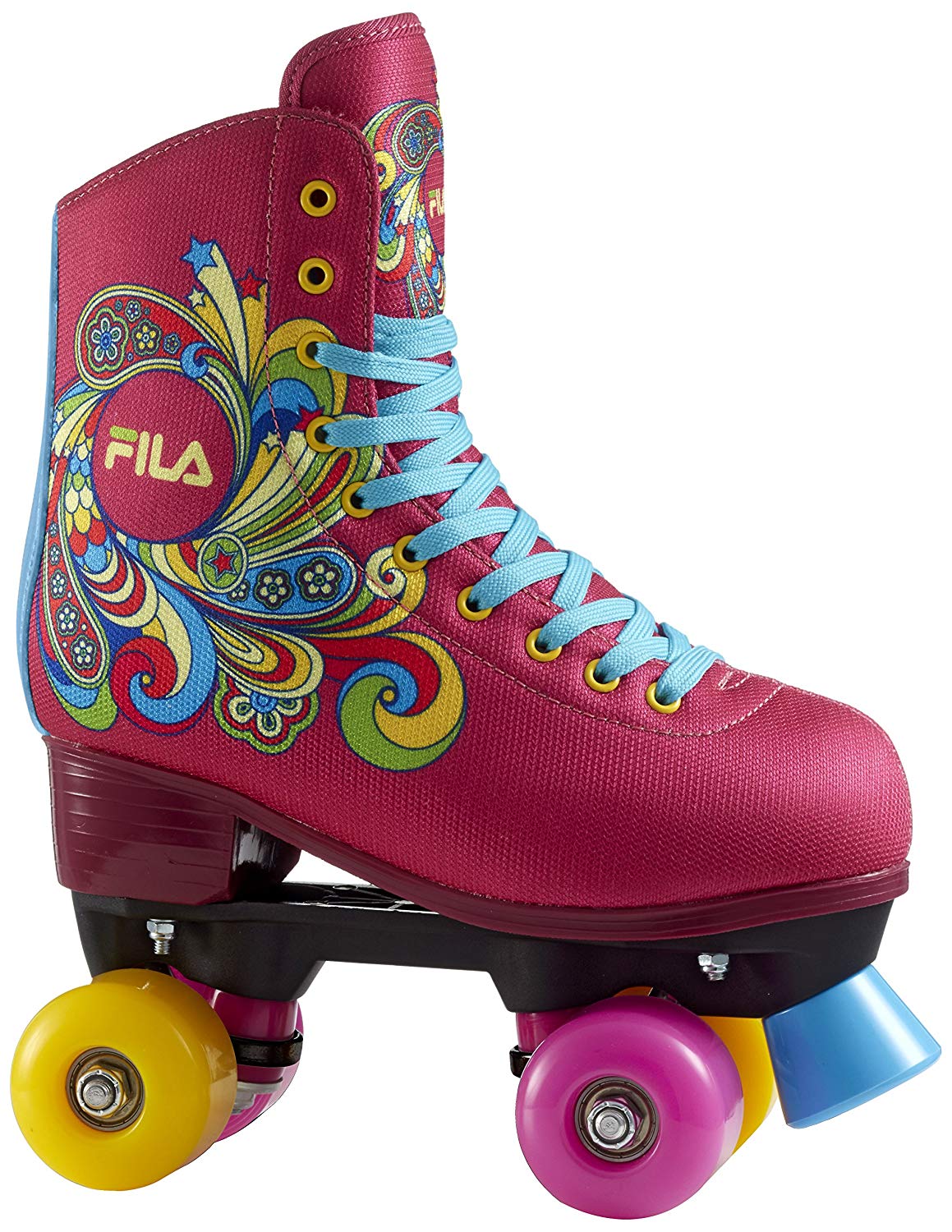 Ancor più originali e sgargianti sono questi pattini a quattro ruote di Fila, con una decorazione laterale davvero unica e un collo del piede un po’ più alto.