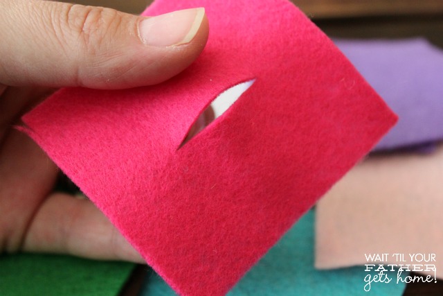 Dal feltro, con le forbici, ricavate vari quadrati di stoffa di circa 5/6 centimetri di lato. Al centro di questi quadratini colorati tagliate (piegandoli a metà per facilitare il taglio) una riga di un paio di centimetri (sarà l'alloggiamento dei bottoni).