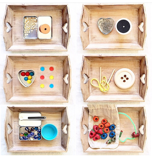 Montessoriana è anche la tavoletta delle trecce, che possiamo appoggiare sul seggiolone. Magari i bimbi sono ancora piccoli per imparare a fare le trecce, ma non lo sono mai per scoprire con le proprie mani nuovi materiali. Quindi proponiamola e lasciamo che esplorino i fili!