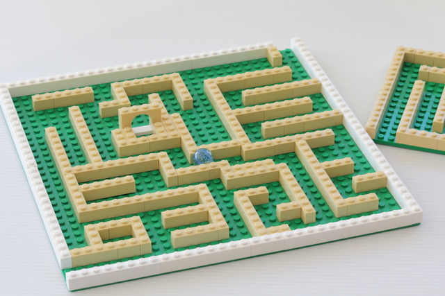 Bellissimo, vero? È super semplice, e bastano il rettangolo piano-base e i classici mattoncini. Se non abbiamo il piano, possiamo costruirlo con altri mattoncini, servirà solo un po’ di pazienza. Dopodiché, possiamo giocare con le biglie.