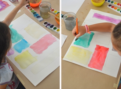 Per prima cosa, sui fogli di carta ruvida disegnate dei quadrati e dei rettangoli abbastanza ampi, e fateli colorare ai bambini con i loro acquerelli, ognuno di diverso colore (in modo da avere successivamente più possibilità).