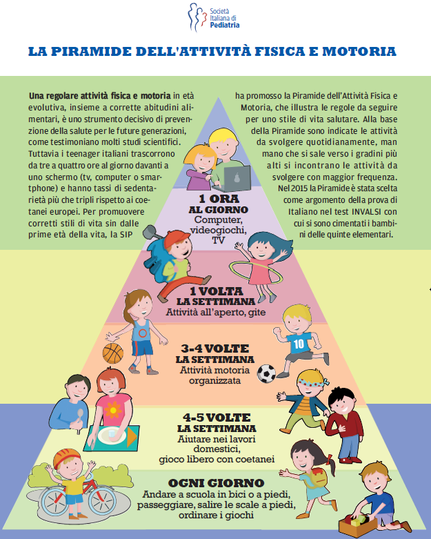 Innanzitutto, dobbiamo essere consapevoli di una cosa: l’attività fisica è sempre importantissima, anche dai primi anni di età. La Società Italiana di Pediatria ha anche stilato una utilissima infografica, la Piramide dello Sport, che ci mostra benissimo la quantità di attività che i nostri bambini dovrebbero svolgere quotidianamente e settimanalmente.
