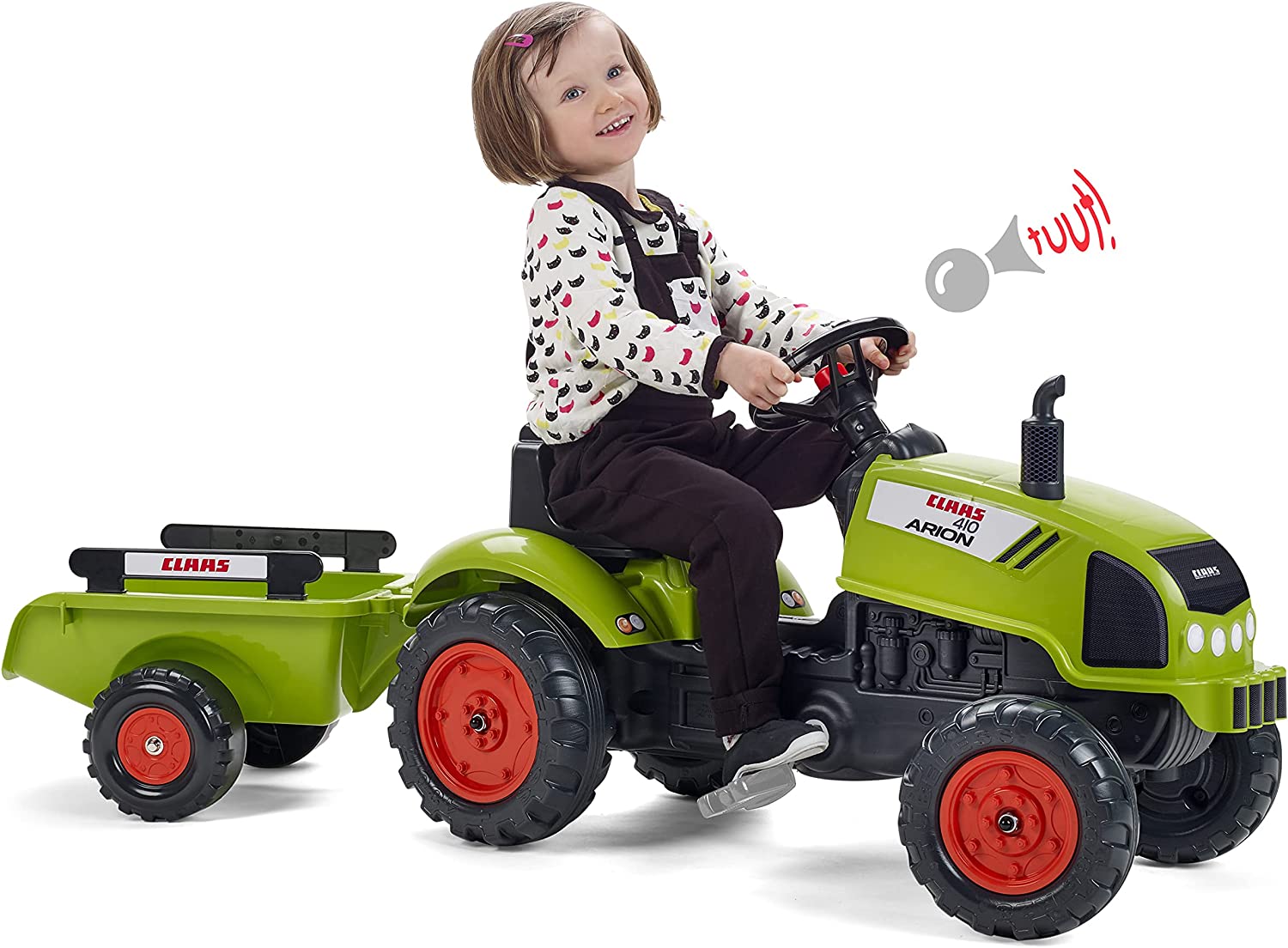 Tra i trattori a pedali più belli in commercio si trova certamente questo di Claas, con rimorchio, volante direzionale e clacson. Si alza anche il cofano, permettendo di sbirciare il motore!