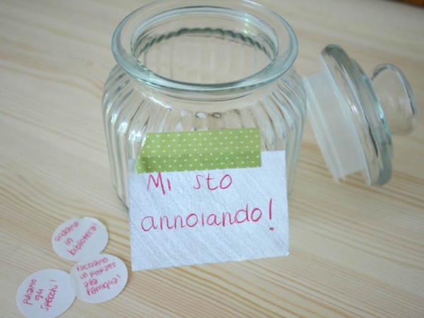 L’idea è davvero carina e semplice: si chiama “barattolo della noia”. Di cosa si tratta? Semplicemente di un bel barattolo (come questo, perfetto grazie al bordo largo che permette di farci passare le mani!) decorato con la scritta “Mi sto annoiando!” e riempito con tanti cartoncini con proposte di attività.