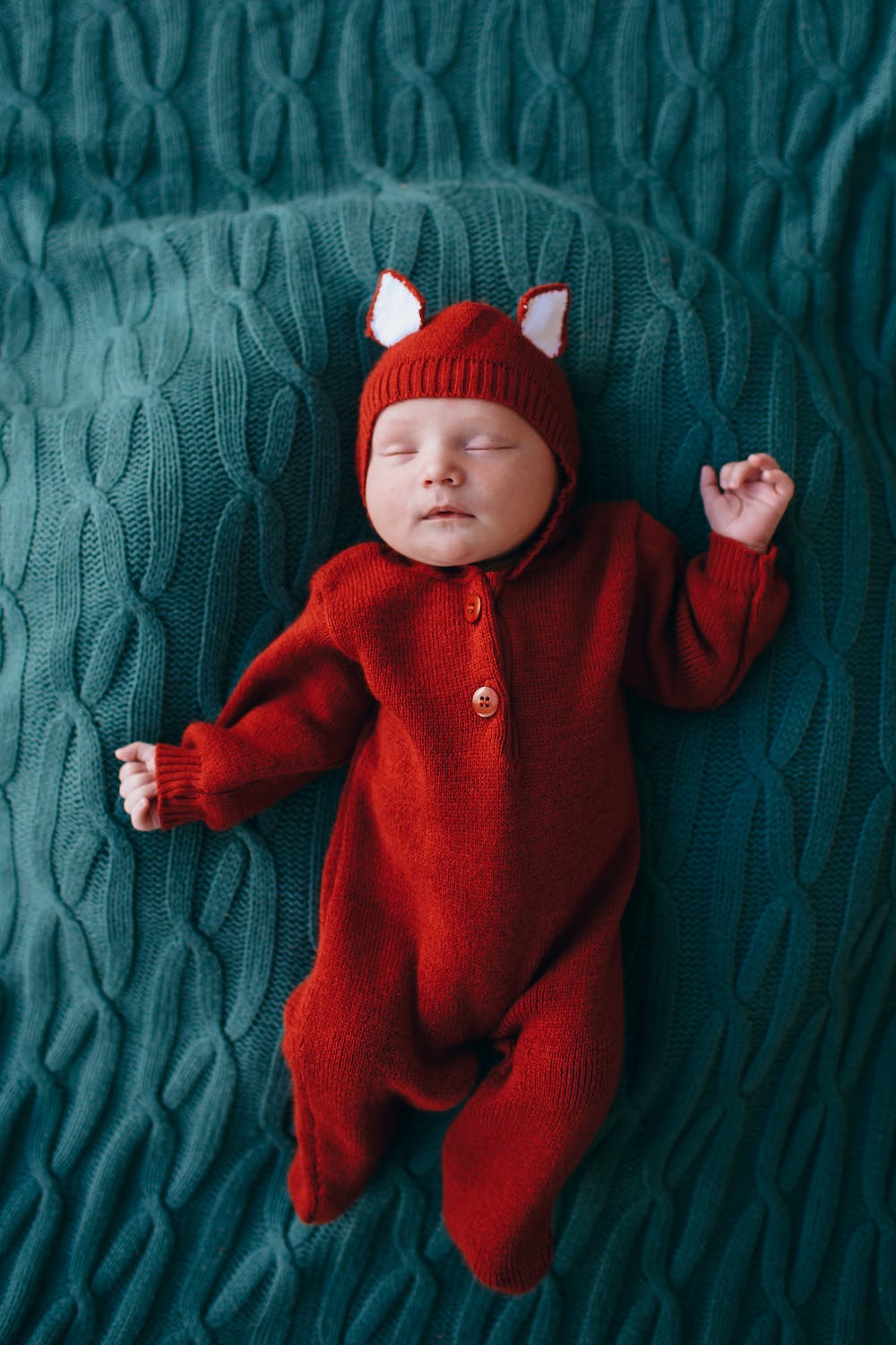 Una tutina color rosso mattone e delle piccole orecchie: la volpe neonata è davvero graziosa.