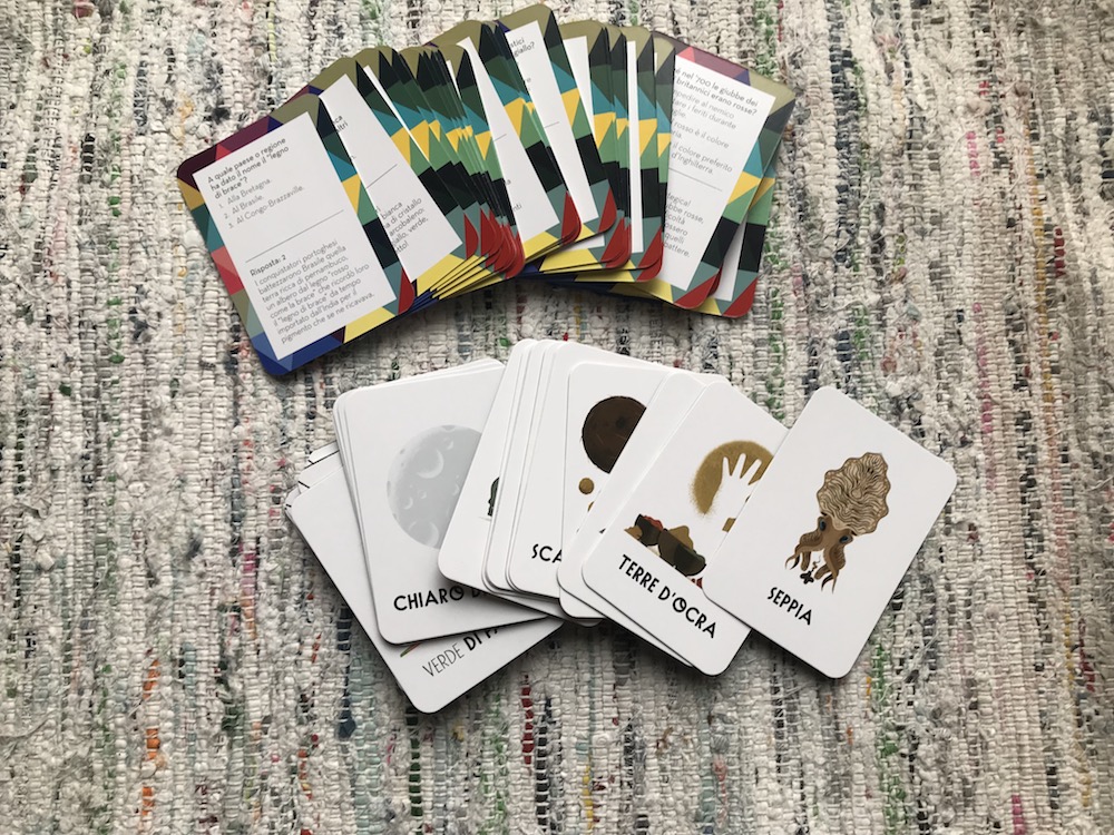 I giocatori vanno da 2 a 6 (è perfetto quindi per le serate in famiglia) e lo scopo è aggiudicarsi per primi le 6 carte Colorama corrispondenti alle 6 carte Sfumature ricevute all’inizio del gioco. Il tutto rispondendo a domande e quiz interessantissimi (sulle zone dalle quali arrivano i colori, sulle proprietà di quel colore, sugli animali, sulla storia…), a cui sapremo rispondere se abbiamo letto il libro ma che è bellissimo provare a indovinare anche a scatola chiusa, per imparare direttamente sul campo!