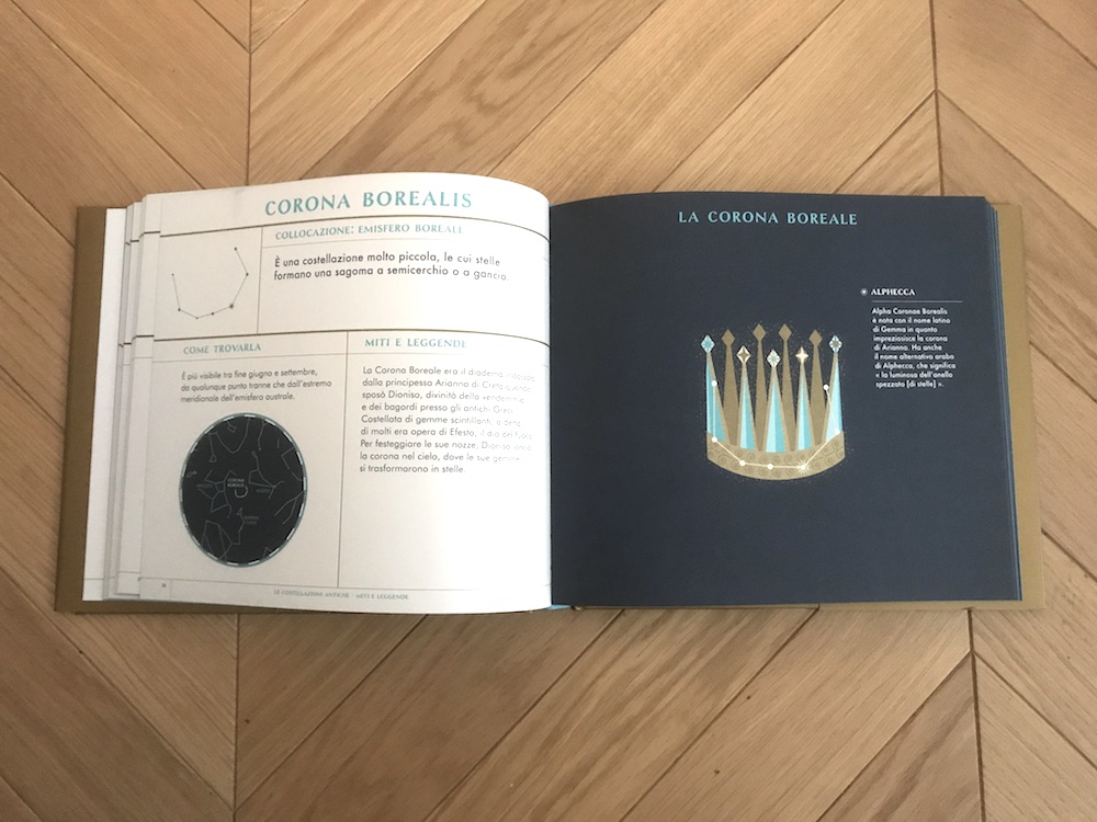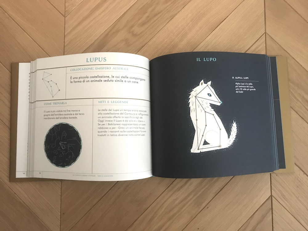 Di ogni costellazione sono presenti la collocazione, una mappa per trovarla nel cielo, i miti e leggende attorno ad essa e, soprattutto, un disegno bellissimo per riconoscerla meglio. “Unendo i puntini” come sulla settimana enigmistica, infatti, i bambini possono vedere come gli agglomerati di stelle formino forme a noi conosciute, figure antropomorfe, simili agli animali o agli oggetti quotidiani, prendendo il nome proprio dall’immagine che ci ricordano.