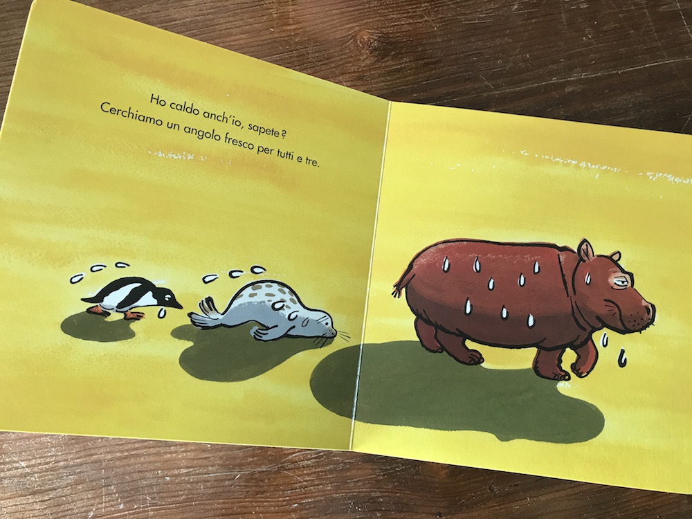 La storiella è semplicissima: narra la vicenda di un piccolo pinguino che soffre il caldo torrido e che trova finalmente ombra. Quest’ombra si rivela però essere quella di una foca, che sta soffrendo proprio come lui. E allora via alla ricerca di un altro posticino ombreggiato. Che però si rivela sempre essere l’ombra proiettata da un altro animale più grande.