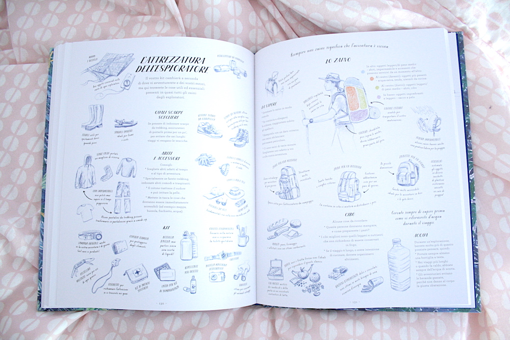Ci sono le liste di ciò che bisogna preparare per pianificare la prossima avventura, i kit per accamparsi, l’illustrazione dell’abbigliamento perfetto per ogni situazione, i tipi di tende, le regole per scegliere il posto migliore per accamparsi, come cucinare (mangiando anche insetti nelle situazioni disperate!), come fare la cacca all’aperto (eh sì, bisogna sapere quali foglie possiamo usare per la nostra igiene e la nostra sicurezza!), come preparare lo zaino e quali case sugli alberi esistano nel mondo.