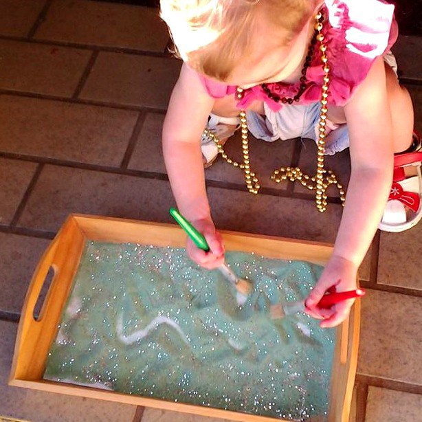1. DISEGNI SULLA SABBIA GLITTER: alleniamo la manualità fine e la percezione dello spazio con della sabbia e dei glitter su un piatto o su un vassoio simile a quello dell'immagine.