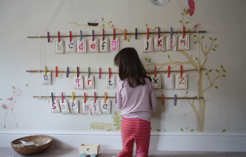 Con dei rami molto lineari, delle mollette e delle lettere in feltro in rilievo potrete creare uno strumento permanente e divertente per aiutare i vostri bambini con lettere e numeri, da sperimentare ad ogni ora del giorno!