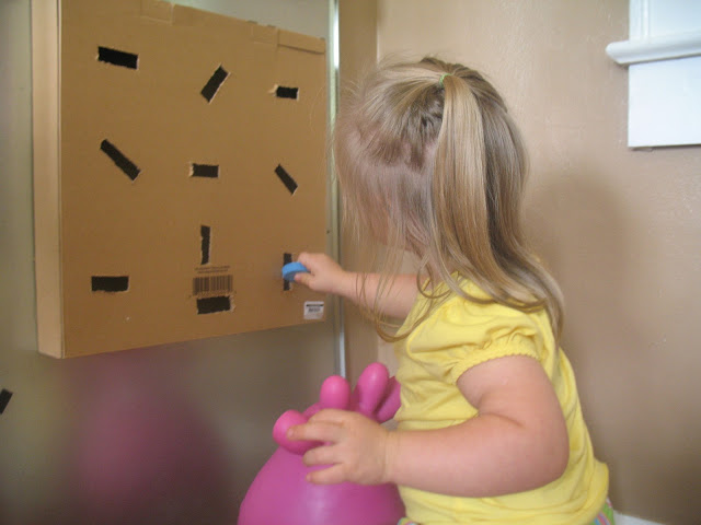 Con delle scatole di cartone e alcuni tappi (di differente grandezza, come i buchi che verranno tagliati nel cartone) si può creare un gioco permanente sulla parete per raffinare le abilità motorie e cognitive dei più piccoli.